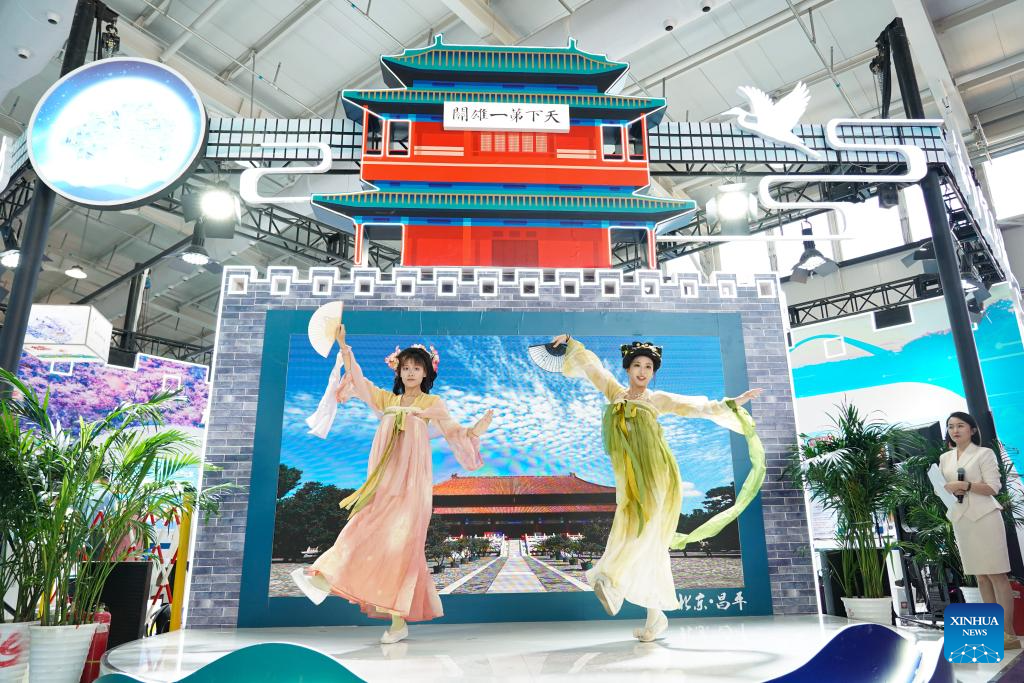 People perform in front of a screen showing Juyongguan section of the Great Wall at the booth of Changping District of Beijing during the 2024 China International Fair for Trade in Services (CIFTIS) in the Cultural &Tourism Service thematic exhibition area at the Shougang Park in Beijing, capital of China, Sept. 13, 2024. The Cultural &Tourism Service thematic exhibition area of this year's CIFTIS reflects the integration of technology and culture. The exhibitions enable multidimensional presentations with new technologies such as immersive digital spaces, virtual reality (VR), augmented reality (AR), and holographic projection. (Xinhua/Chen Zhonghao)