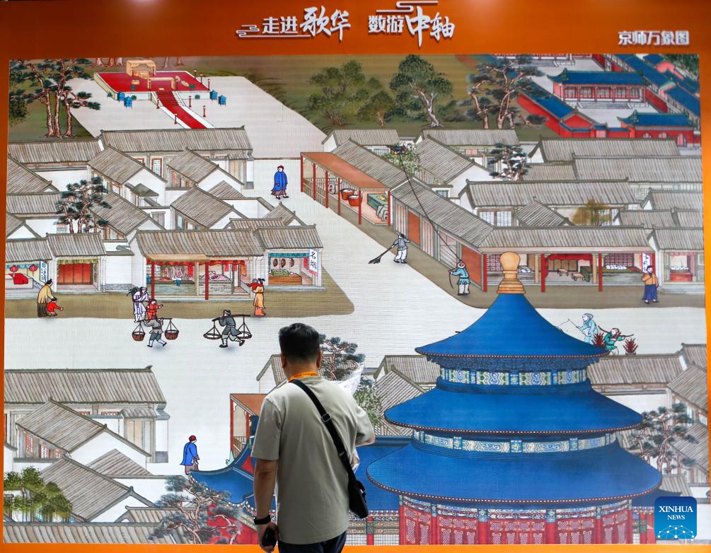 Visitors look at a digital image of the Beijing Central Axis during the 2024 China International Fair for Trade in Services (CIFTIS) in the Cultural &Tourism Service thematic exhibition area at the Shougang Park in Beijing, capital of China, Sept. 16, 2024. The Cultural &Tourism Service thematic exhibition area of this year's CIFTIS reflects the integration of technology and culture. The exhibitions enable multidimensional presentations with new technologies such as immersive digital spaces, virtual reality (VR), augmented reality (AR), and holographic projection. (Xinhua/Ding Hongfa)