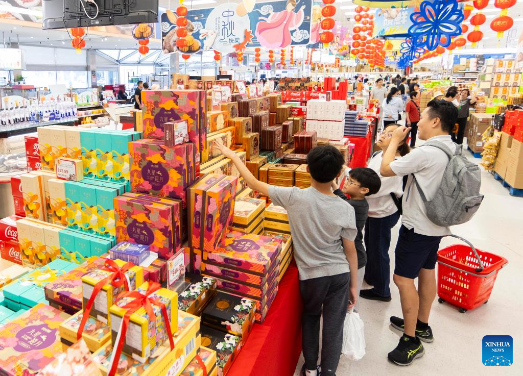 Customers shop for mooncakes ahead of the Mid-Autumn Festival at a supermarket in Toronto, Canada, on Sept. 15, 2024. The Chinese Mid-Autumn Festival falls on Sept. 17 this year. (Photo by Zou Zheng/Xinhua)