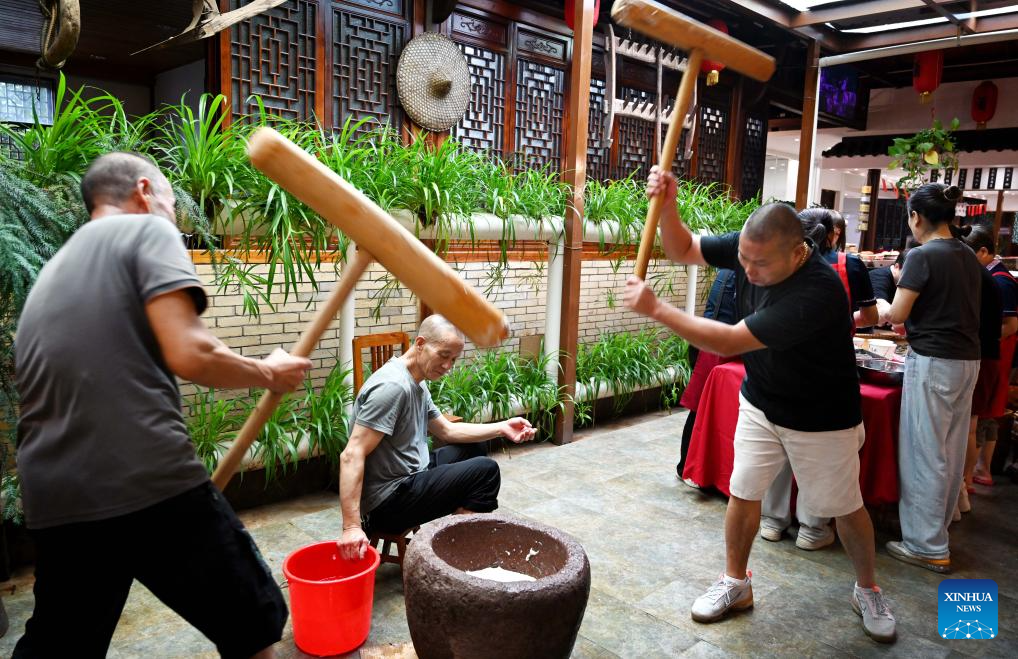 People experience making Ciba, a traditional glutinous rice cake, in Wuyi County, east China's Zhejiang Province, Sept. 15, 2024. The Mid-Autumn Festival is one of China's most important traditional holidays. Taking place annually on the 15th day of the eighth month in the Chinese lunar calendar, it will be observed on Sept. 17 this year. (Photo by Zhang Jiancheng/Xinhua)