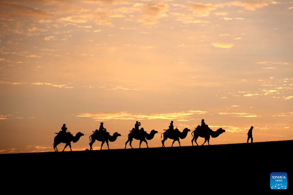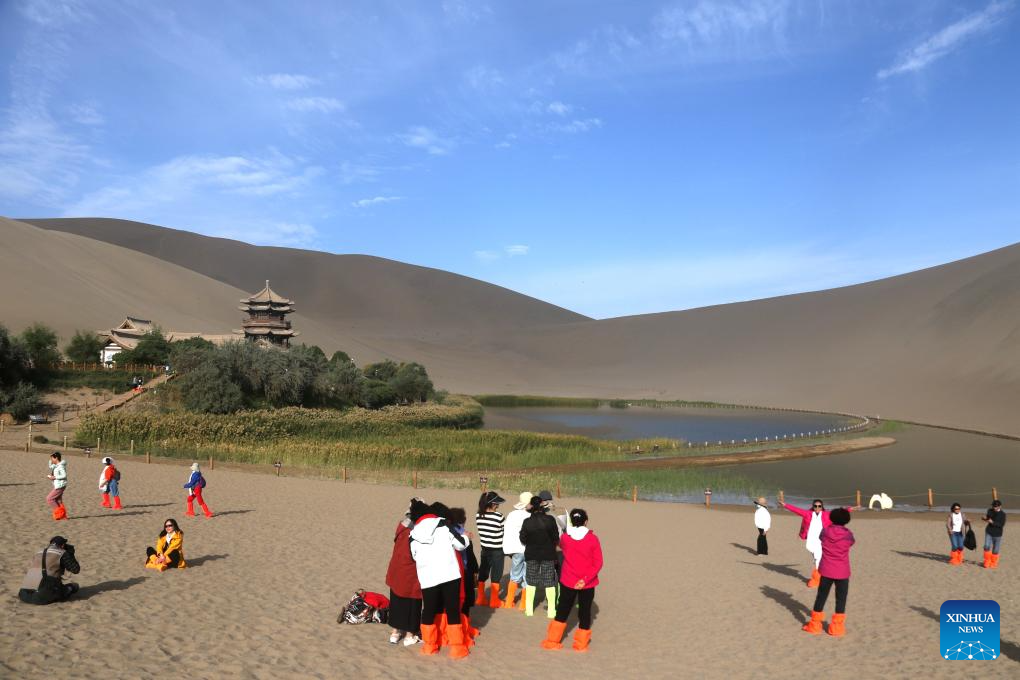 People visit the Mingsha Mountain and Crescent Spring scenic spot in the city of Dunhuang, northwest China's Gansu Province, Sept. 15, 2024. The Mid-Autumn Festival is one of China's most important traditional holidays. Taking place annually on the 15th day of the eighth month in the Chinese lunar calendar, it will be observed on Sept. 17 this year. (Photo by Zhang Xiaoliang/Xinhua)