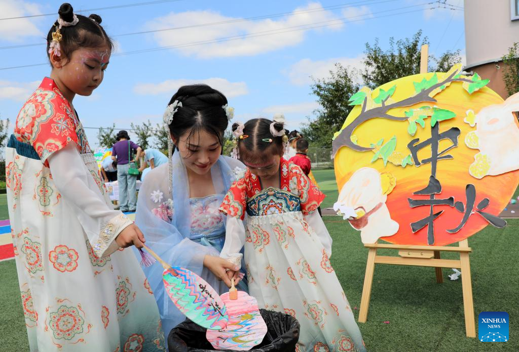 A mother and kids make lacquer fans at a cultural event in a kindergarten in Boxing County, east China's Shandong Province, Sept. 15, 2024. The Mid-Autumn Festival is one of China's most important traditional holidays. Taking place annually on the 15th day of the eighth month in the Chinese lunar calendar, it will be observed on Sept. 17 this year. (Photo by Chen Bin/Xinhua)