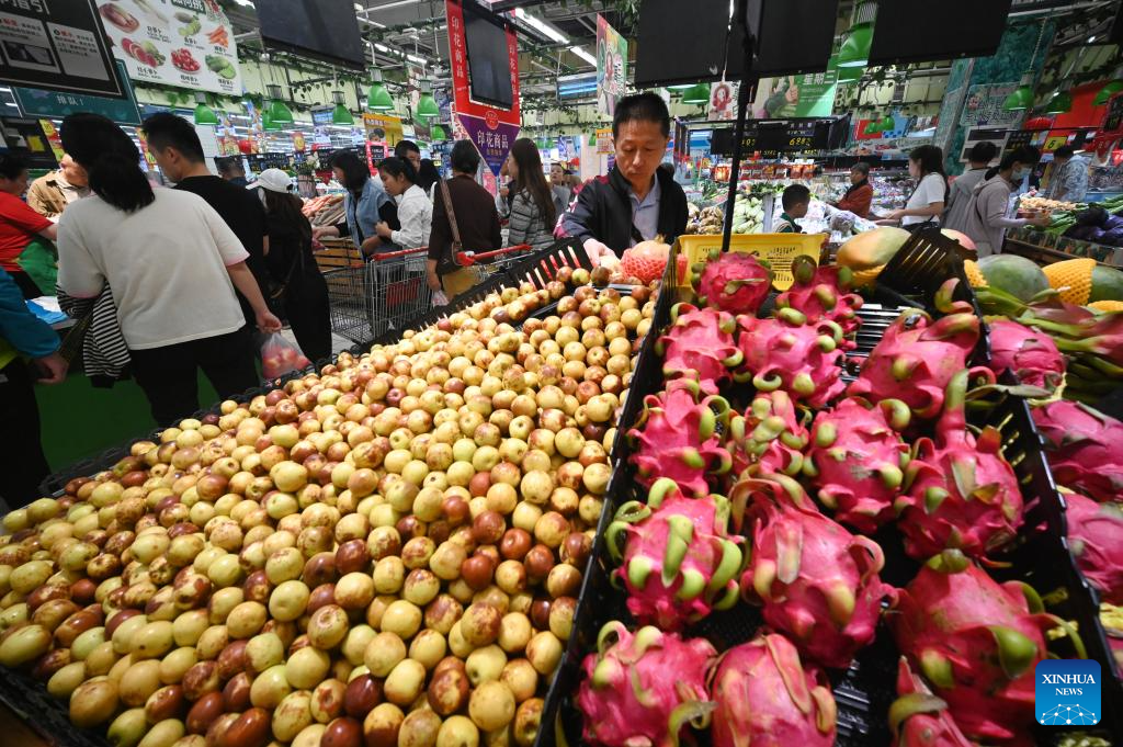 People select fruits at a supermarket in Kaifeng, central China's Henan Province, Sept. 15, 2024. The Mid-Autumn Festival is one of China's most important traditional holidays. Taking place annually on the 15th day of the eighth month in the Chinese lunar calendar, it will be observed on Sept. 17 this year. (Photo by Li Junsheng/Xinhua)