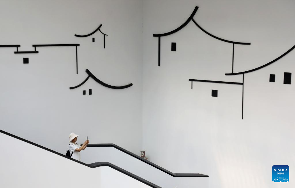 A tourist takes pictures at a folk custom hall within Huqiu Mountain scenic spot in Suzhou, east China's Jiangsu Province, Sept. 15, 2024. The Mid-Autumn Festival is one of China's most important traditional holidays. Taking place annually on the 15th day of the eighth month in the Chinese lunar calendar, it will be observed on Sept. 17 this year. (Photo by Hang Xingwei/Xinhua)