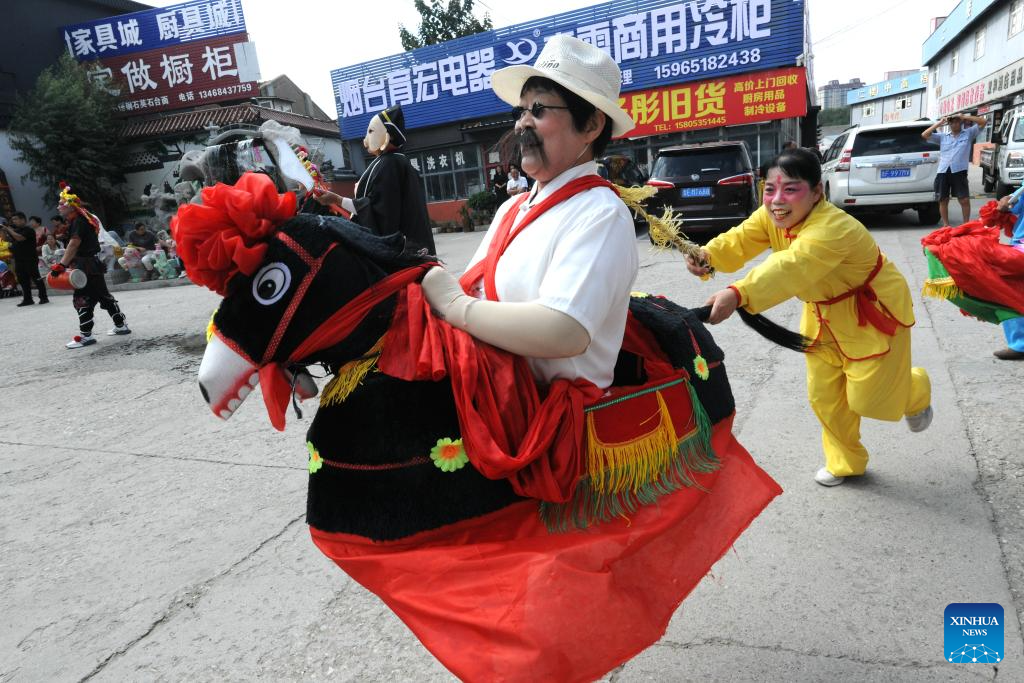 Actors perform Yangge folk dance in Yantai, east China's Shandong Province, Sept. 15, 2024. The Mid-Autumn Festival is one of China's most important traditional holidays. Taking place annually on the 15th day of the eighth month in the Chinese lunar calendar, it will be observed on Sept. 17 this year. (Photo by Shen Jizhong/Xinhua)