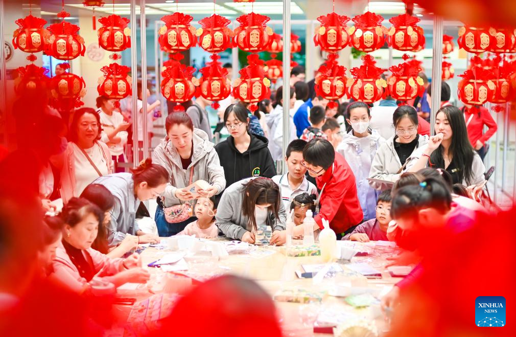 People make lanterns for the upcoming Mid-Autumn Festival at the provincial library in Changchun, northeast China's Jilin Province, Sept. 14, 2024. The Mid-Autumn Festival is one of China's most important traditional holidays. Taking place annually on the 15th day of the eighth month in the Chinese lunar calendar, it will be observed on Sept. 17 this year. (Xinhua/Yan Linyun)
