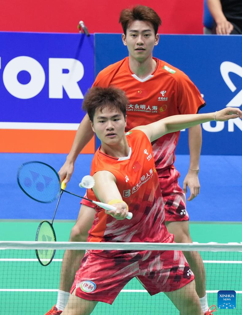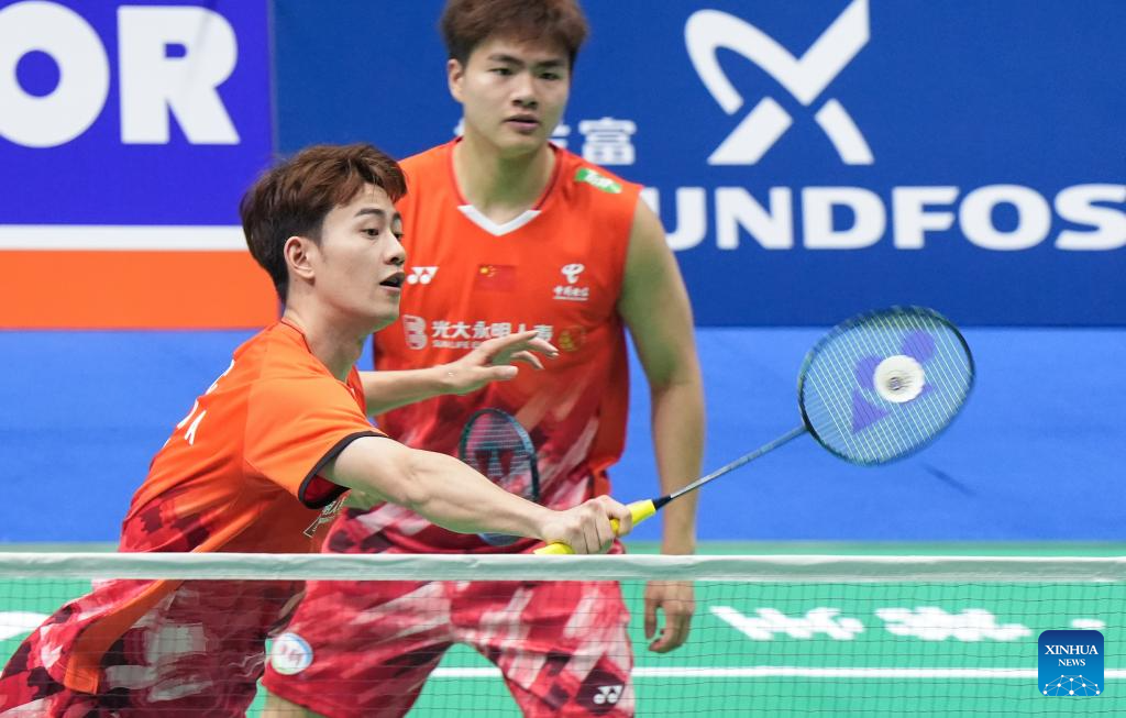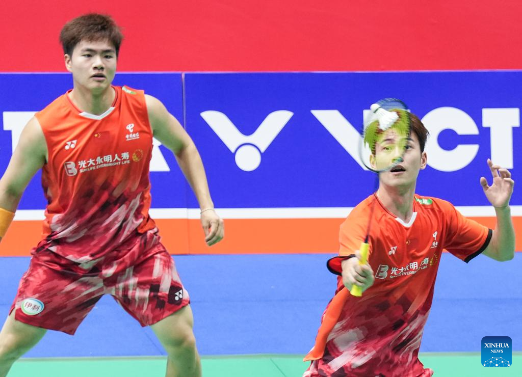 Liang Weikeng/Wang Chang (R) of China compete during the men's doubles first round match between Liang Weikeng/Wang Chang of China and Christo Popov/Toma Junior Popov of France at China Open 2024 badminton tournament in Changzhou, east China's Jiangsu Province, Sept. 17, 2024. (Xinhua/Yang Lei)