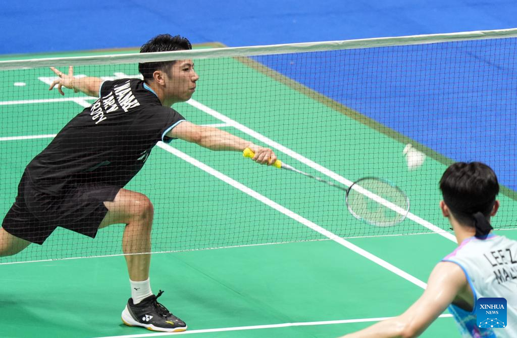 Watanabe Koki of Japan hits a return to Lee Zii Jia of Malaysia during the men's singles 1st round match at the China Open 2024 badminton tournament in Changzhou, east China's Jiangsu Province, Sept. 17, 2024. (Xinhua/Yang Lei)