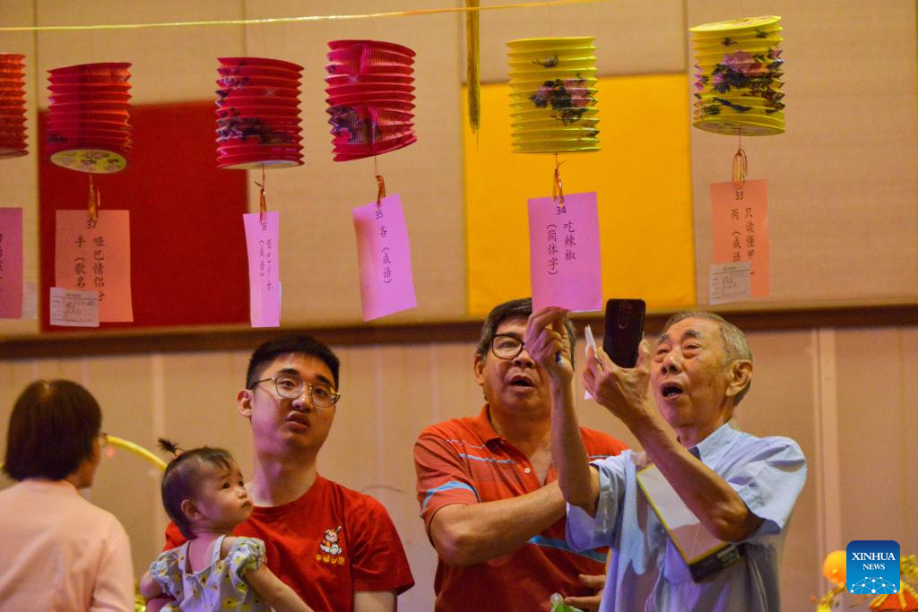 People guess lantern riddles during the Mid-Autumn Festival in Klang of Selangor state, Malaysia, Sept. 17, 2024. (Photo by Chong Voon Chung/Xinhua)