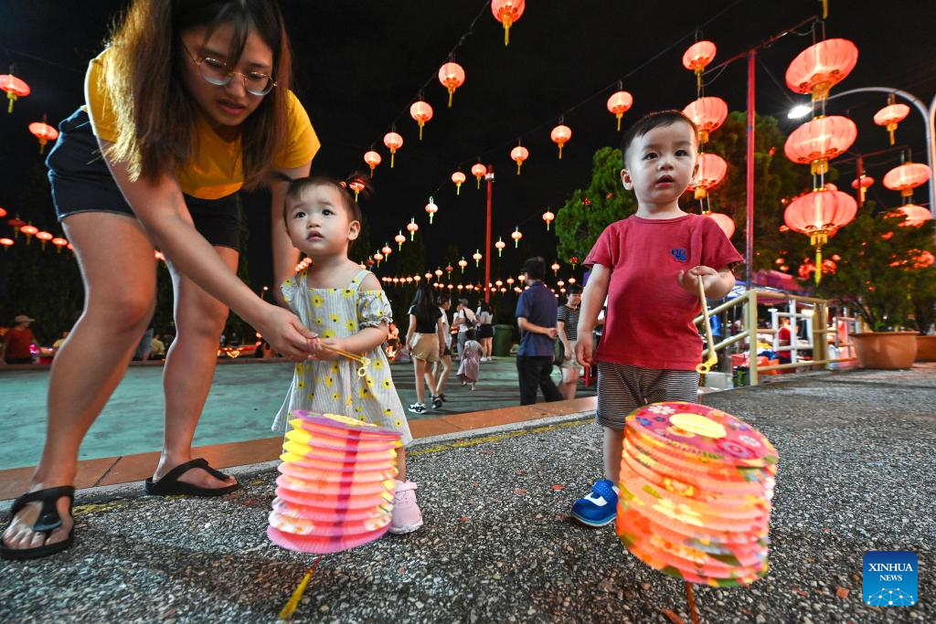 Children hold lanterns to celebrate the Mid-Autumn Festival in Klang of Selangor state, Malaysia, Sept. 17, 2024. (Photo by Chong Voon Chung/Xinhua)