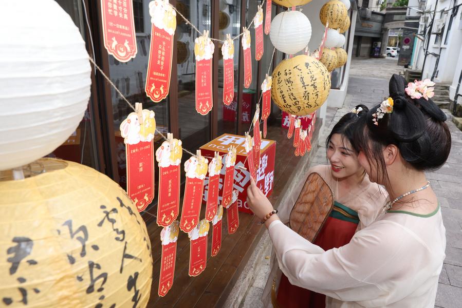 Tourists read lantern riddles in Qianyuan Town of Deqing County in Huzhou City, east China's Zhejiang Province, Sept. 17, 2024. (Photo by Ni Lifang/Xinhua)