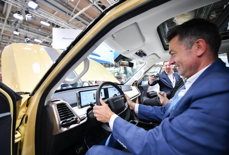 A man tries an electric pickup truck at the booth of Chinese automaker SAIC Maxus during the media preview of the International Motor Show (IAA) Transportation 2024 in Hannover, Germany, Sept. 16, 2024. (Xinhua/Ren Pengfei)