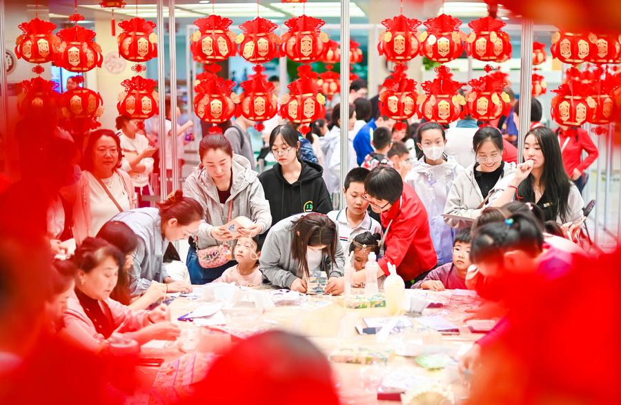 People make lanterns for the upcoming Mid-Autumn Festival at the provincial library in Changchun, northeast China's Jilin Province, Sept. 14, 2024. (Xinhua/Yan Linyun)