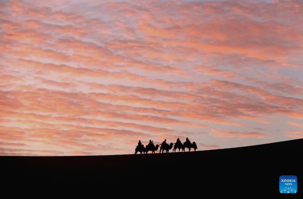 Tourists ride camels at the Mingshashan and Crescent Lake, an oasis scenic spot in the Gobi Desert, in Dunhuang, northwest China's Gansu Province, Sept. 16, 2024. (Photo by Zhang Xiaoliang/Xinhua)