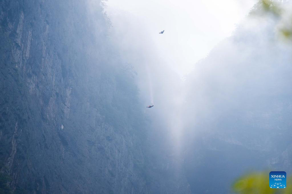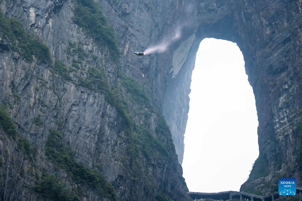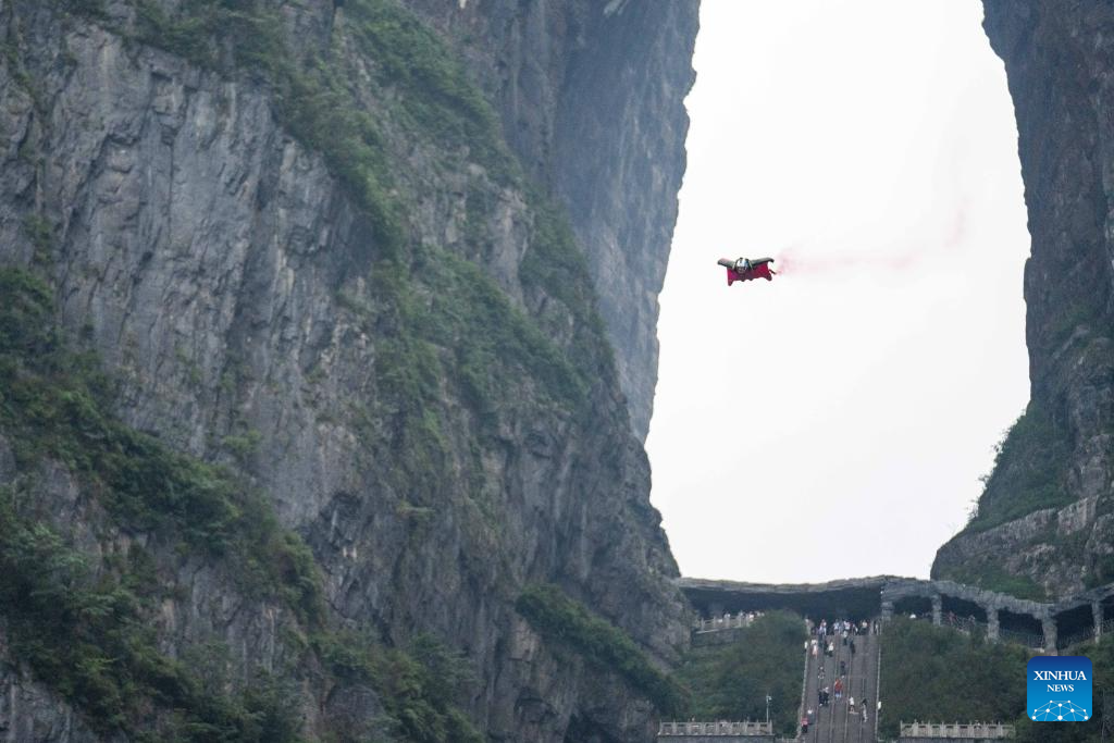 Wingsuit flying athletes compete during the flying through targets competition at the 10th World Wingsuit League (WWL) Wingsuit Flying World Championship at the Tianmen Mountain National Forest Park in Zhangjiajie, central China's Hunan Province, on Sept. 19, 2024. (Xinhua/Chen Sihan)