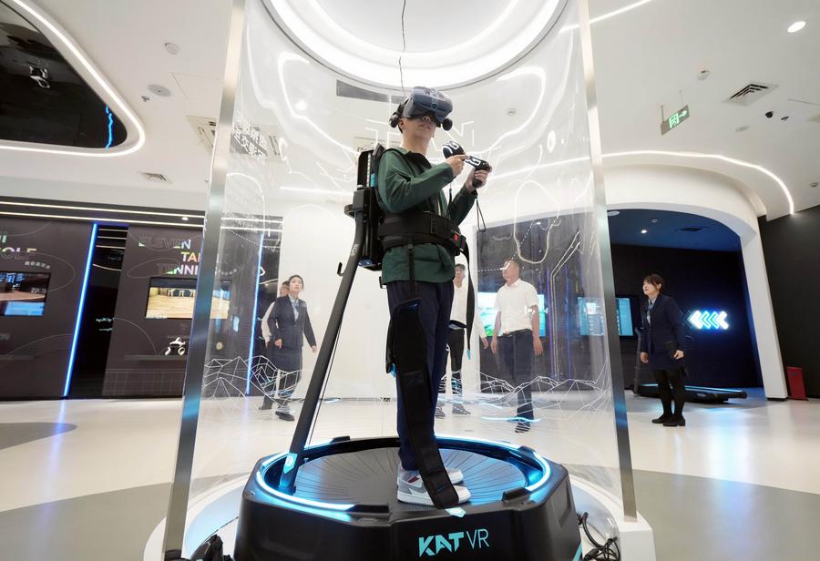 A visitor tries VR-powered gaming at an exhibition hall of a metaverse industrial park in Kunshan, east China's Jiangsu Province, June 1, 2024. (Xinhua/Li Ga)