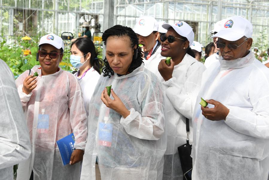 Participants of the 2nd Forum on China-Africa Cooperation in Agriculture try local produce while visiting an agricultural science and technology innovation center in Sanya, south China's Hainan Province, Nov. 14, 2023. (Xinhua/Yang Guanyu)