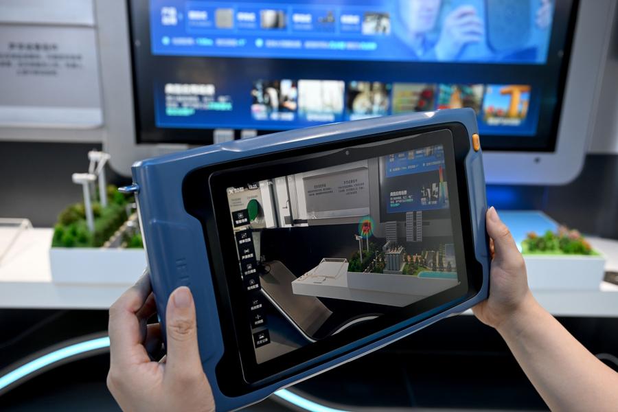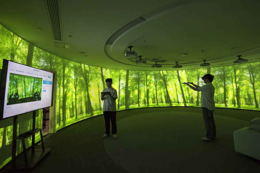 Staff of Reacool Medical Technology Co., Ltd. demonstrate a pain-relieving rehabilitation training application in the Vision Valley of China in Wuhu City, east China's Anhui Province, Sept. 20, 2024. (Photo by Xiao Benxiang/Xinhua)