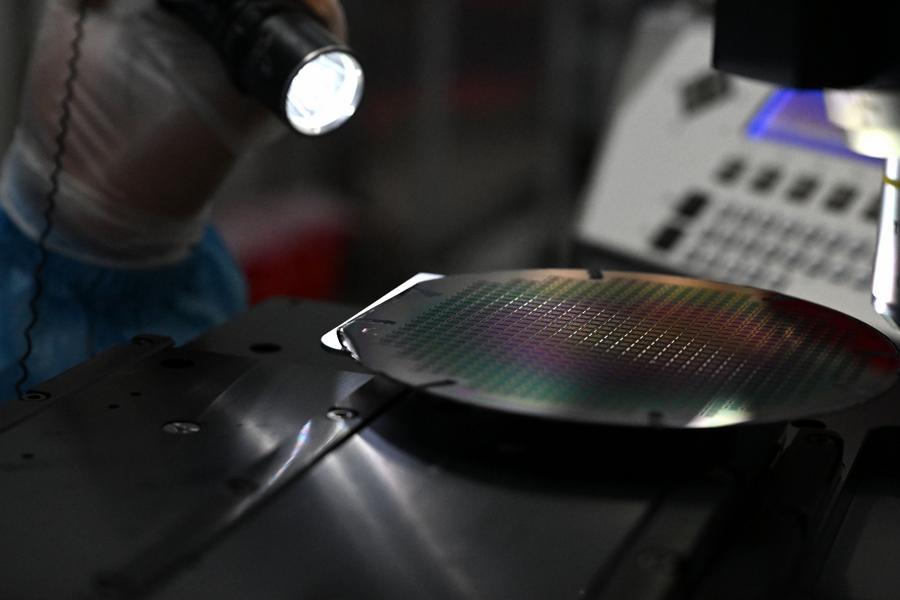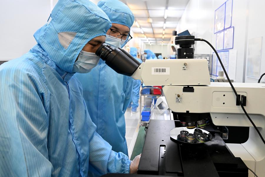 Staff of Anhui North Microelectronics Research Institute Group Corporation Limited check on MEMS wafers in the China Sensor Valley at Bengbu City, east China's Anhui Province, Sept. 12, 2024. (Xinhua/Huang Bohan)