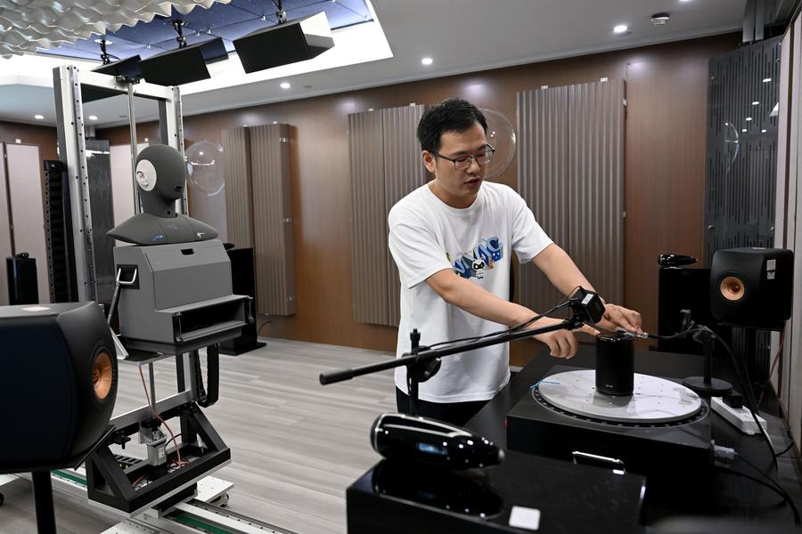 A staff member of the National Intelligent Voice Innovation Center tests on an intelligent speaker at the China Speech Valley in Hefei City, east China's Anhui Province, Sept. 20, 2024. (Xinhua/Huang Bohan)
