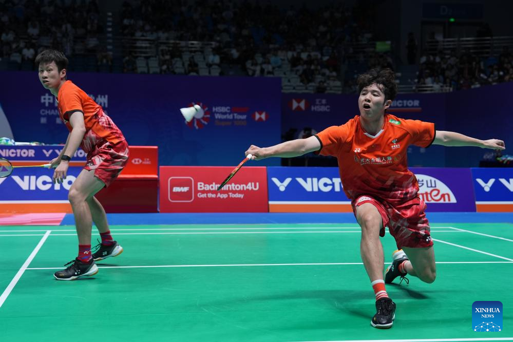 He Jiting (R)/Ren Xiangyu of China compete during the men's doubles final match against Goh Sze Fei/Nur Izzuddin of Malaysia at the China Open 2024 badminton tournament in Changzhou, east China's Jiangsu Province, Sept. 22, 2024. (Xinhua/Li Bo)