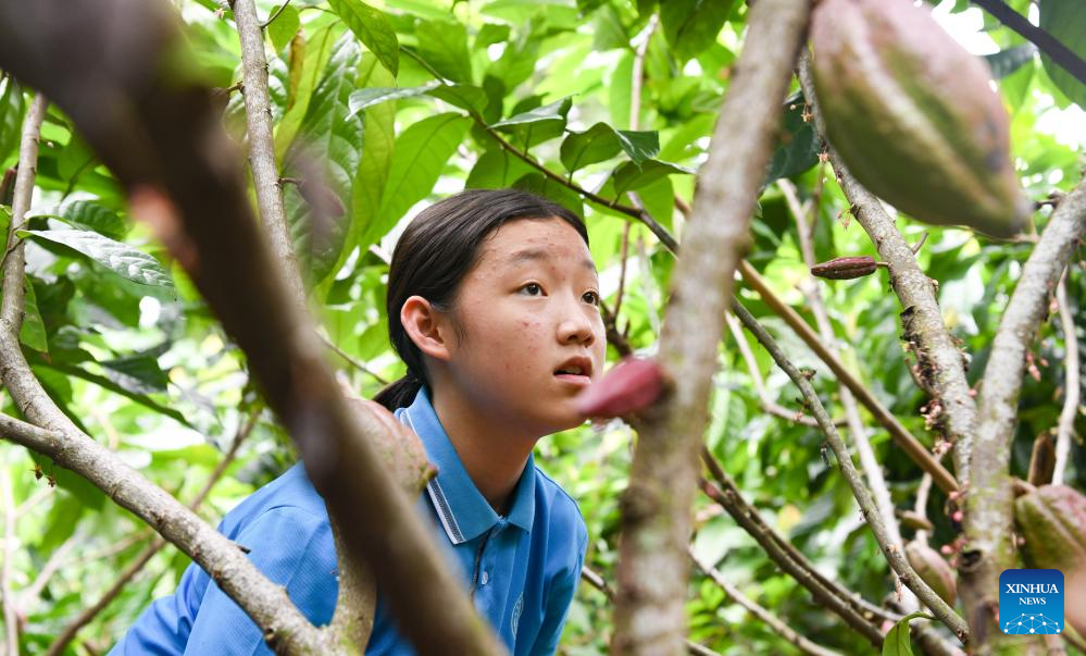 Students view cocoa fruits in Xinglong Tropical Botanical Garden in Wanning City, south China's Hainan Province, Sept. 22, 2024. The science popularization activity focusing on cocoa was held here on Sunday by Spice and Beverage Research Institute under Chinese Academy of Tropical Agricultural Sciences. (Xinhua/Yang Guanyu)