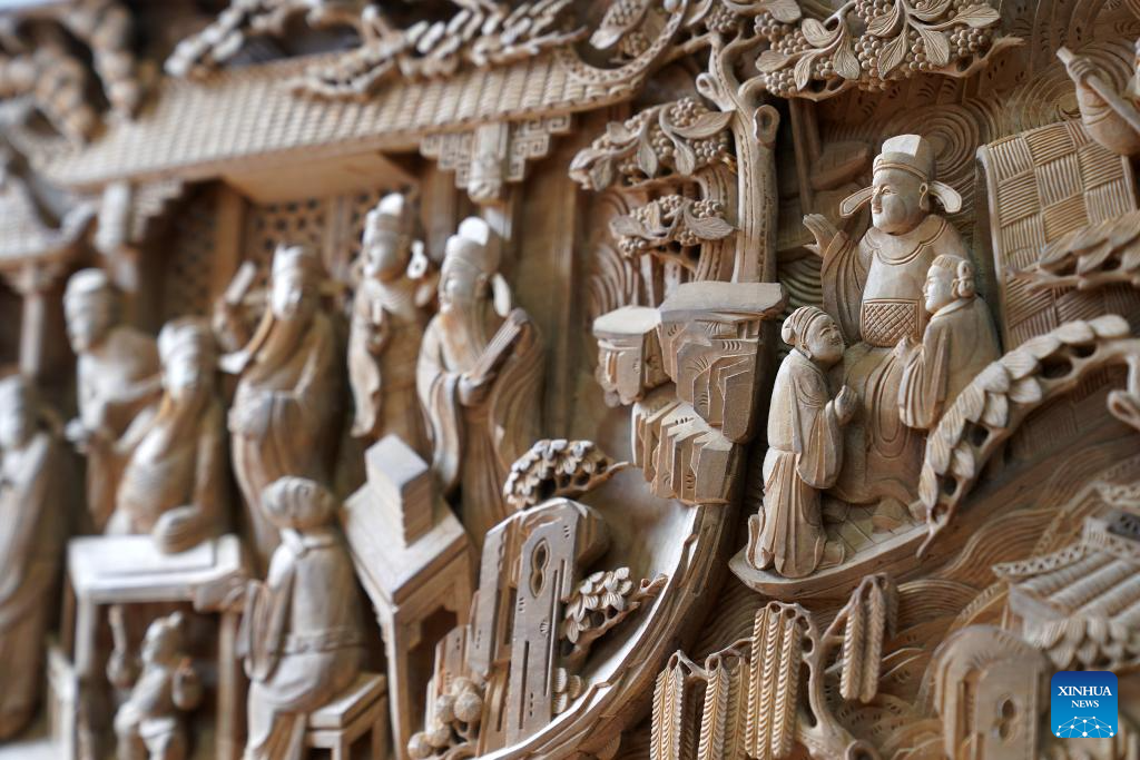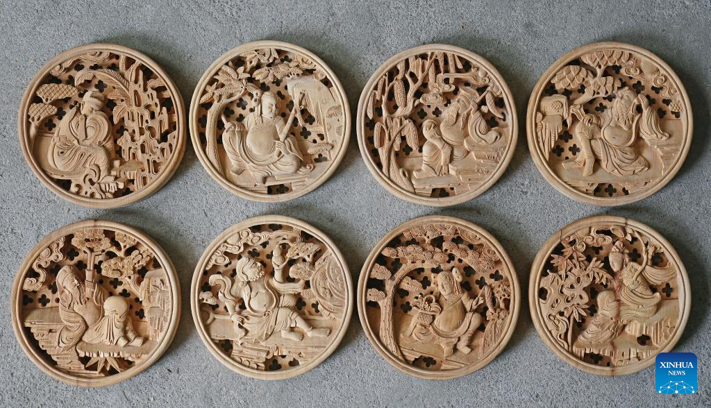 Wood carving works are pictured in Wangkou Village of Wuyuan County, east China's Jiangxi Province, Sept. 20, 2024. (Xinhua/Wan Xiang)