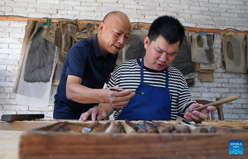 Yu Youhong (L) teaches his apprentice carving technique in Wangkou Village of Wuyuan County, east China's Jiangxi Province, Sept. 20, 2024. (Xinhua/Wan Xiang)