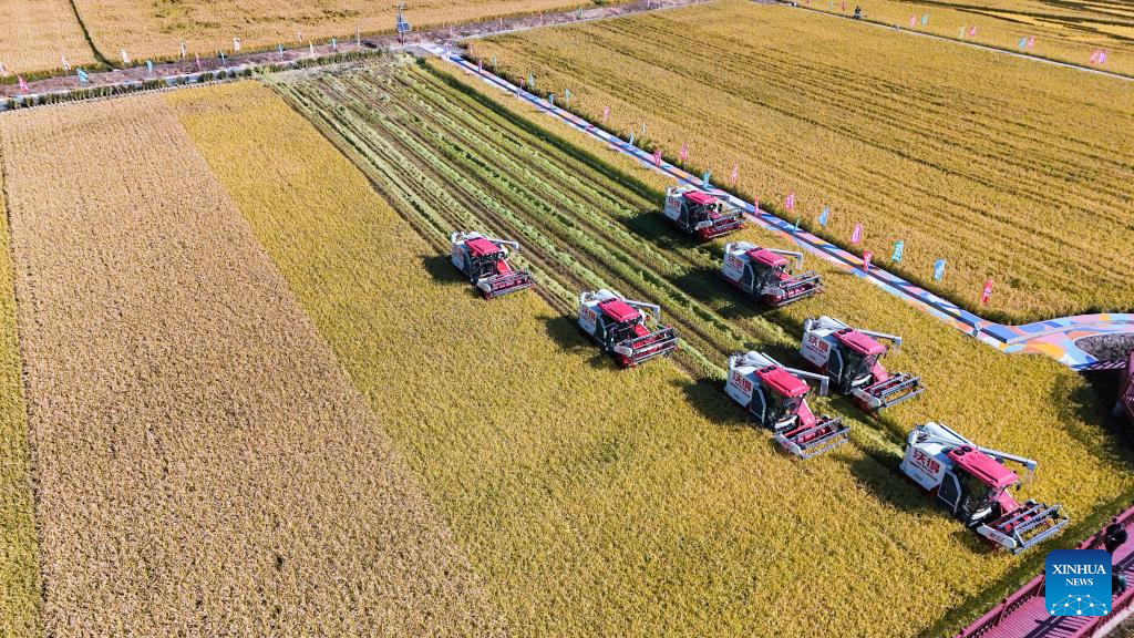 Harvesters are pictured in a paddy field in Fangzheng County of Harbin, northeast China's Heilongjiang Province, Sept. 22, 2024. (Xinhua/Wang Song)
