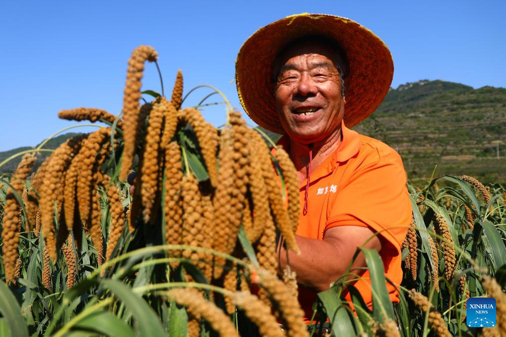 A farmer displays newly-harvested grain in Zaozhuang City, east China's Shandong Province, Sept. 22, 2024. (Photo by Zhang Qiang/Xinhua)