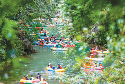 Photo shows tourists rafting at a scenic area in Shibing county, Qiandongnan Miao and Dong Autonomous Prefecture, southwest China's Guizhou Province. (Photo/Mo Guibin)