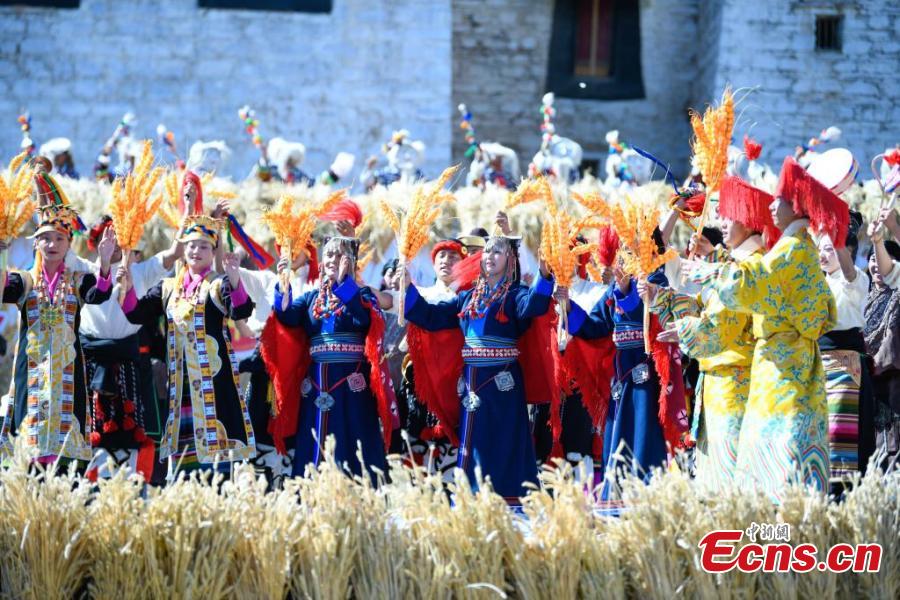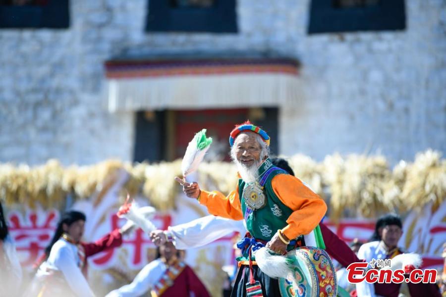 A performance is staged to celebrate the 7th Chinese Farmers' Harvest Festival in Shannan City, southwest China's Xizang Autonomous Region, Sept. 22, 2024. (Photo/China News Service)