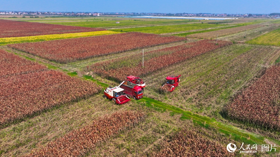 Harvesters reap sorghum at a cooperative's planting base in Hexing village, Mishi township, Jingzhou district, Jingzhou city, central China's Hubei Province, Sept. 2, 2024. (People's Daily Online/Wang Guoji)