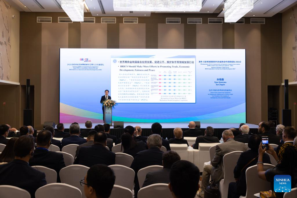 The report "Global Survey: BRICS Cooperation in the New Era of Global Development 2024" is released during the BRICS Seminar on Governance & Cultural Exchanges Forum 2024 in Moscow, Russia, Sept. 23, 2024. (Xinhua/Bai Xueqi)