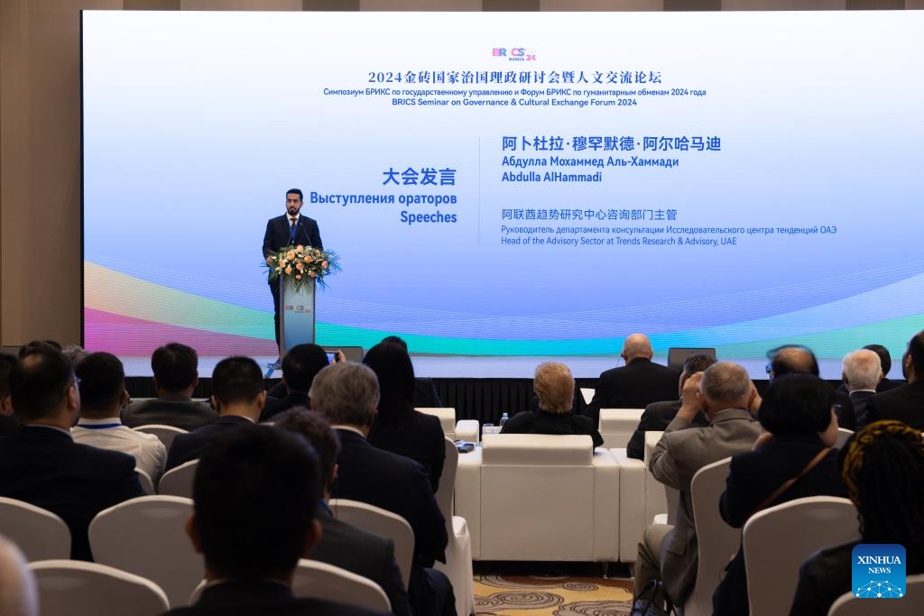 Abdulla Al Hammadi, head of the Advisory Sector at Trends Research & Advisory of the United Arab Emirates, speaks during the BRICS Seminar on Governance & Cultural Exchanges Forum 2024 in Moscow, Russia, Sept. 23, 2024. (Xinhua/Bai Xueqi)