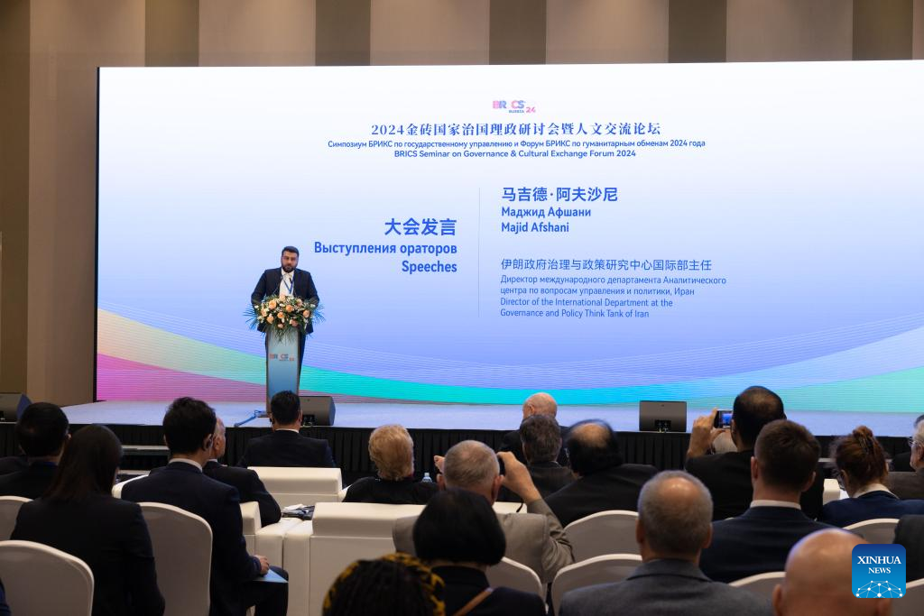 Majid Afshani, director of the International Department at the Governance and Policy Think Tank of Iran, speaks during the BRICS Seminar on Governance &Cultural Exchanges Forum 2024 in Moscow, Russia, Sept. 23, 2024. (Xinhua/Bai Xueqi)