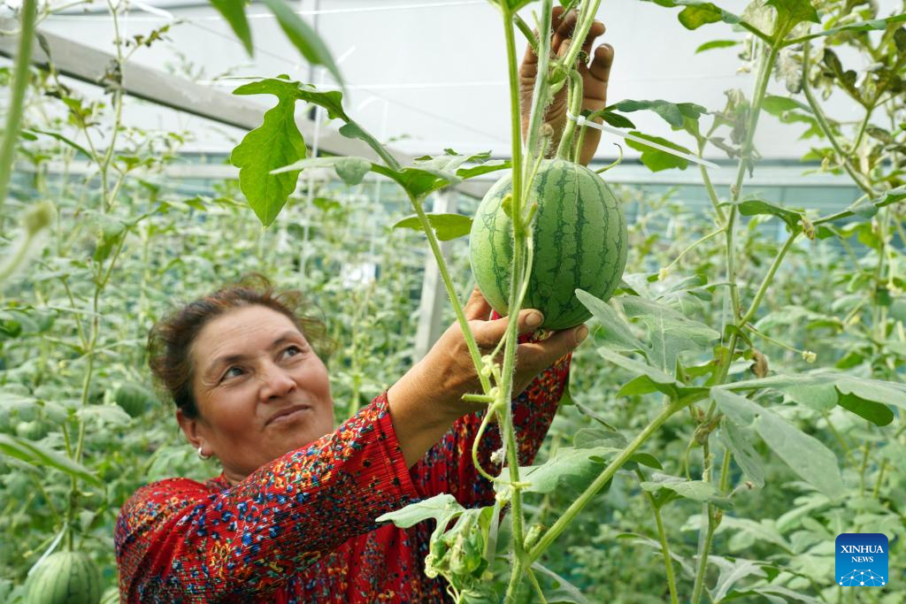 A worker works at a watermelon cultivation base, one of the "pairing assistance" programs of east China's Shandong province, in Shule County of Kashgar, northwest China's Xinjiang Uygur Autonomous Region, Sept. 21, 2024. (Xinhua/Zhao Yusi)?