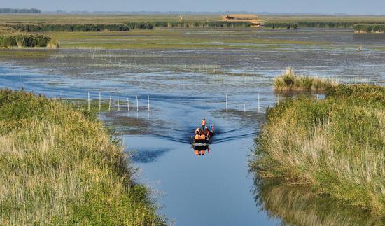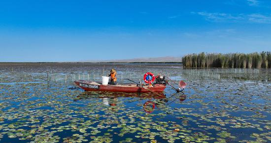 A farmer harvests crabs on Bosten Lake. (Photo/Chinanews.com)
