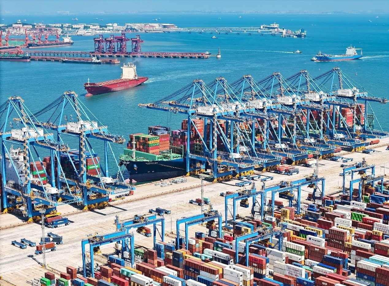 A cargo vessel docks at a port in the Qingdao area of the China (Shandong) Pilot Free Trade Zone in east China's Shandong province. (People's Daily Online/Zhang Jingang)
