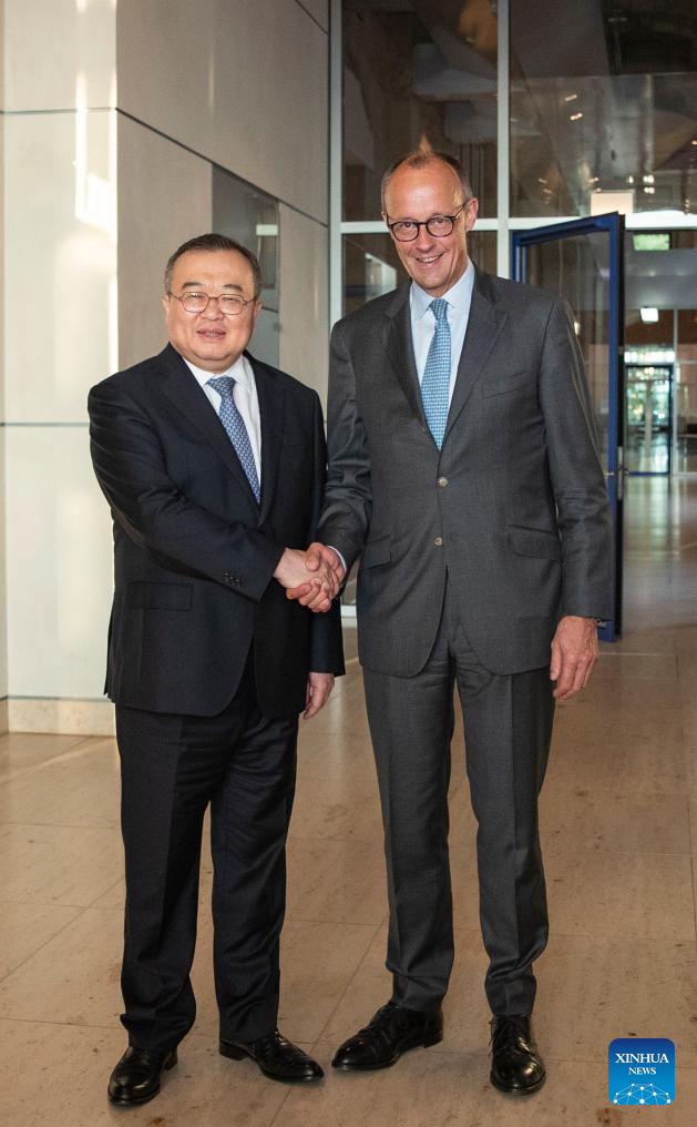 Liu Jianchao, head of the International Department of the Communist Party of China (CPC) Central Committee, meets with Friedrich Merz, chairman of the Christian Democratic Union (CDU) and chairman of the Christian Democratic Union and the Christian Social Union (CDU/CSU) parliamentary group in the Bundestag, in Berlin, Germany, Sept. 24, 2024. Liu led a CPC delegation on a visit to Germany from Sept. 22 to 25. (Xinhua/Zhang Fan)