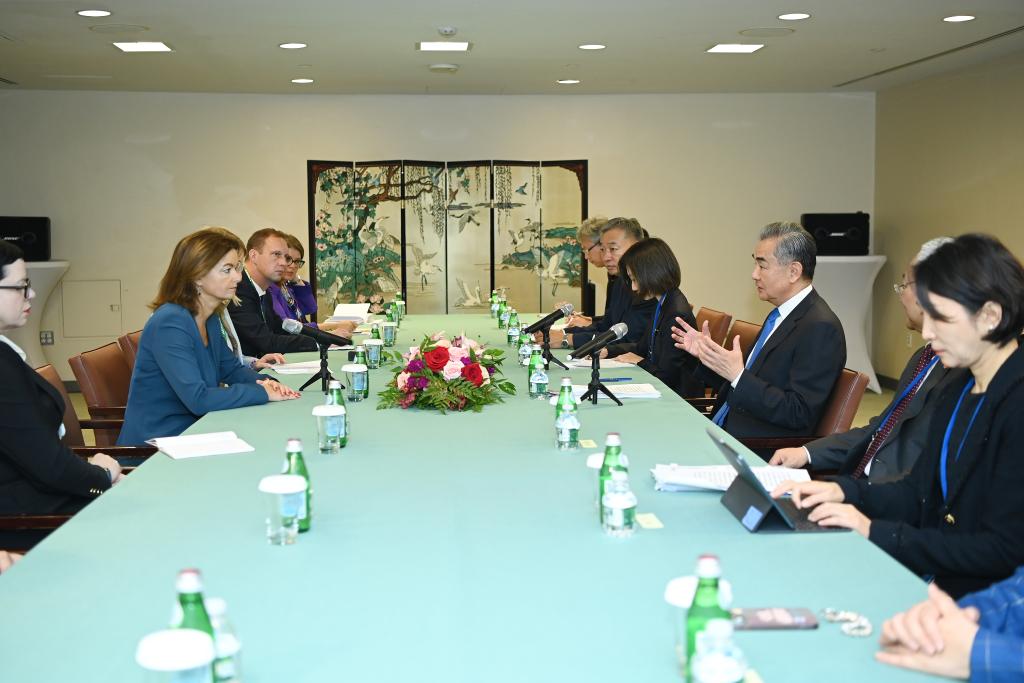 Chinese Foreign Minister Wang Yi, also a member of the Political Bureau of the Communist Party of China Central Committee, meets with Slovenian Deputy Prime Minister and Minister of Foreign and European Affairs Tanja Fajon on the sidelines of the 79th Session of the UN General Assembly in New York, Sept. 25, 2024. (Xinhua/Li Rui)