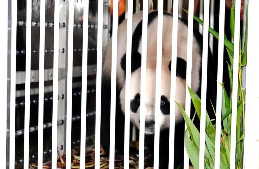 Giant panda An An is seen in a transport cage at the Dujiangyan base of the China Conservation and Research Center for Giant Panda in Dujiangyan, southwest China's Sichuan Province, Sept. 25, 2024. (Photo: China News Service/Li Chuanyou)