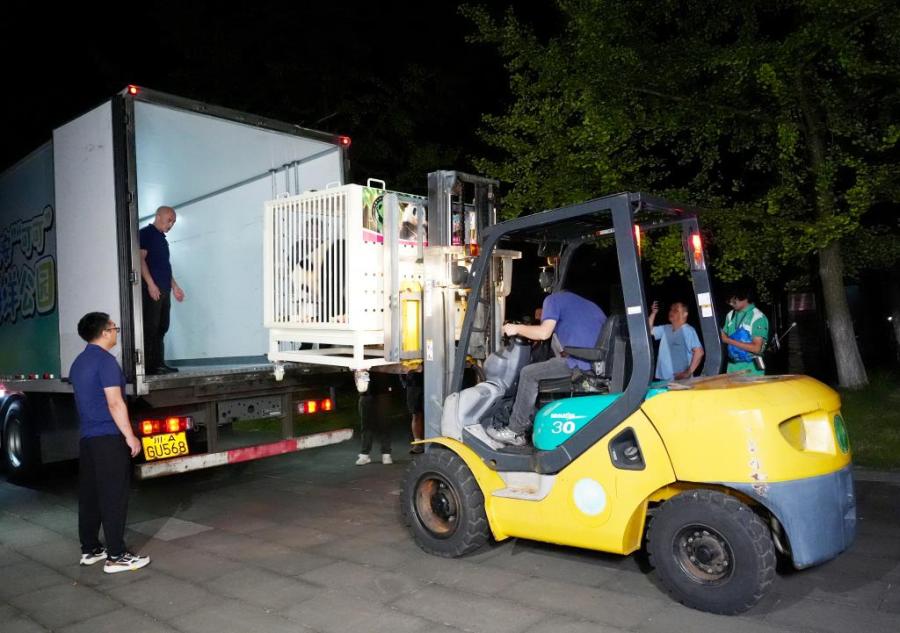 Staff members transport a giant panda onto a van at the Dujiangyan base of the China Conservation and Research Center for Giant Panda in Dujiangyan, southwest China's Sichuan Province, Sept. 25, 2024. (Photo: China News Service/Li Chuanyou)
