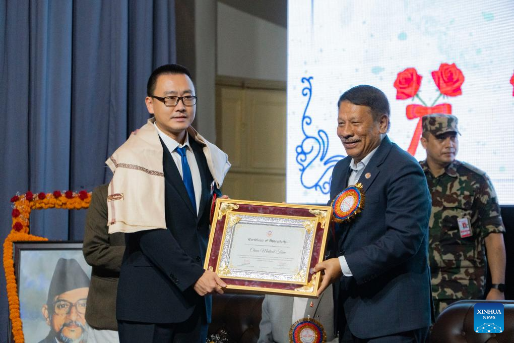Prakash Man Singh (R), Nepal's deputy prime minister and minister for urban development, presents a "certificate of outstanding contribution award" to a representative of the Chinese medical team in Bharatpur, Nepal, Sept. 26, 2024. (Xinhua)