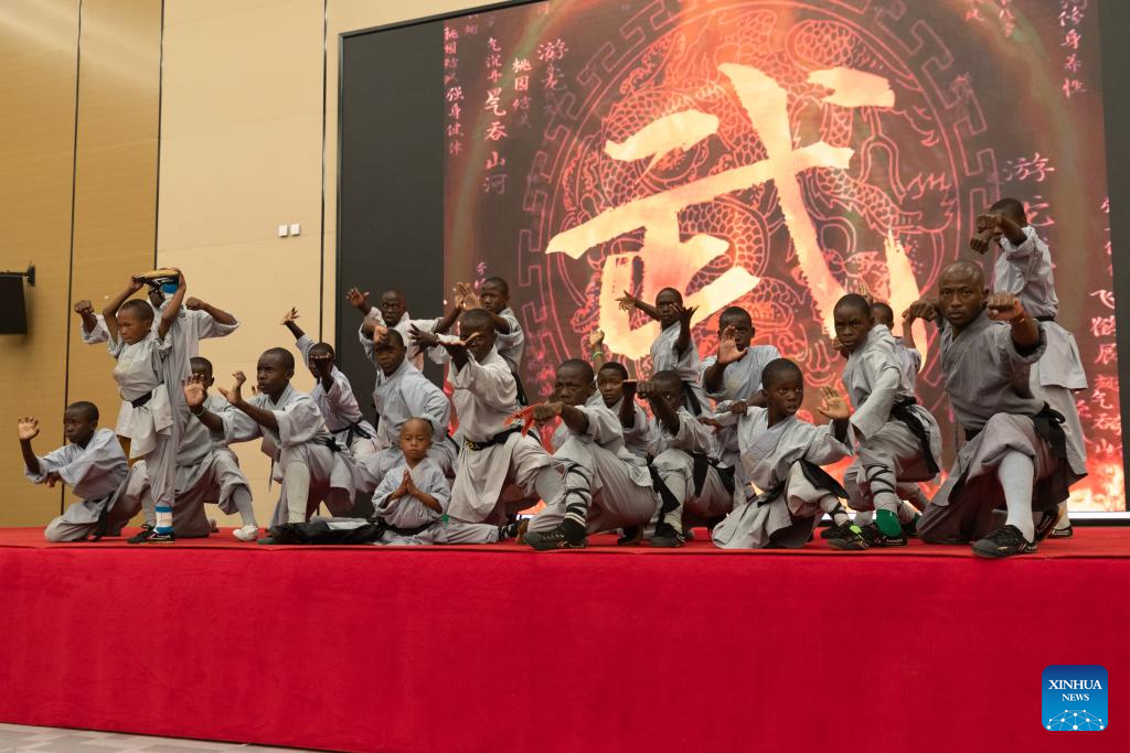 A martial art master (1st R, front) and students from the Zambia Shaolin Temple cultural center perform Chinese Kung Fu at a reception hosted by the Chinese Embassy in Zambia, in Lusaka, Zambia, Sept. 26, 2024, The Chinese Embassy in Zambia hosted a reception on Thursday in Lusaka, the capital, celebrating the 75th anniversary of the founding of the People's Republic of China. This event also marked the 60th anniversary of diplomatic relations between China and Zambia. (Xinhua/Peng Lijun)