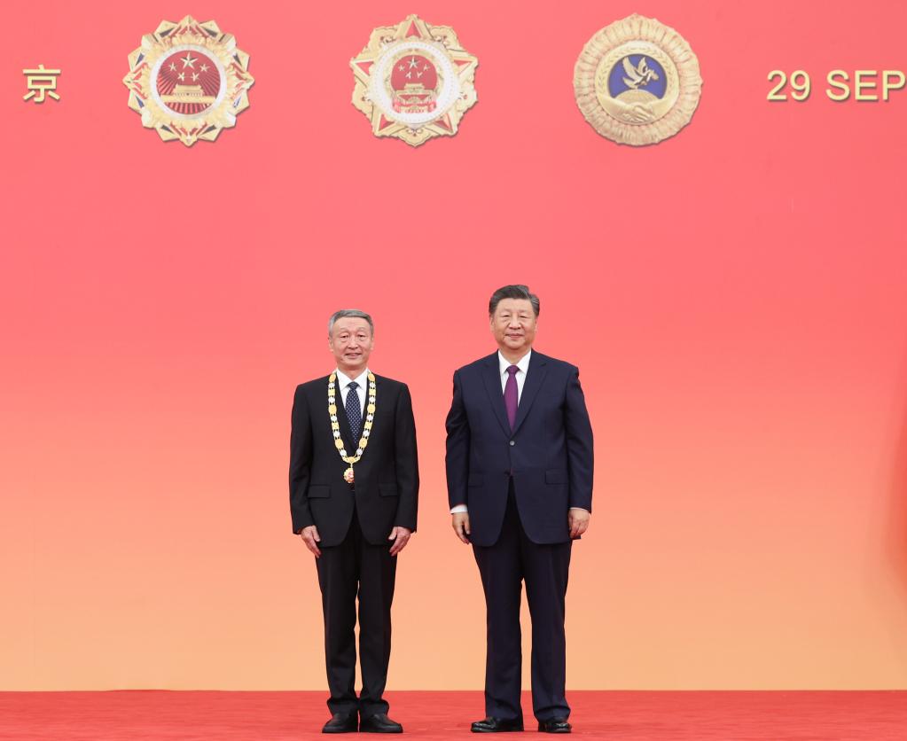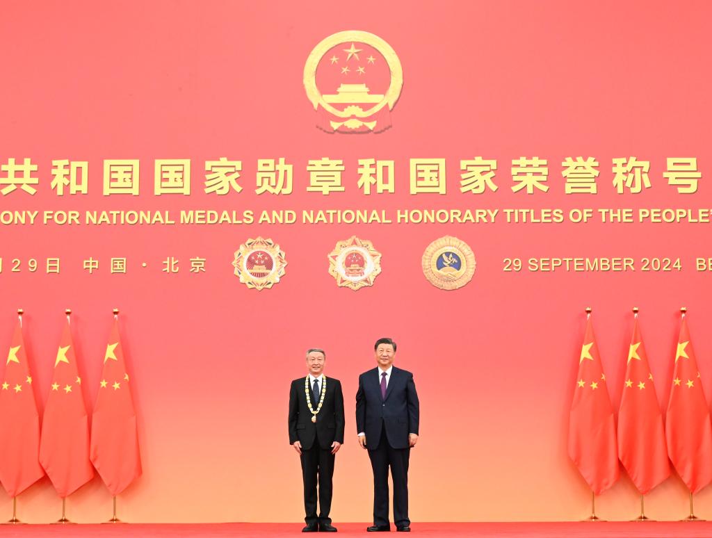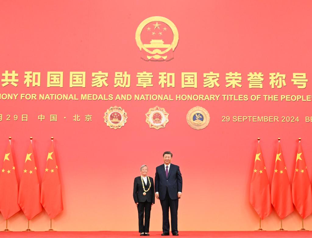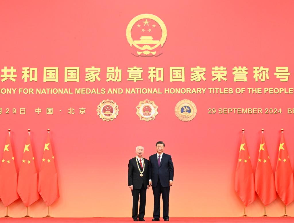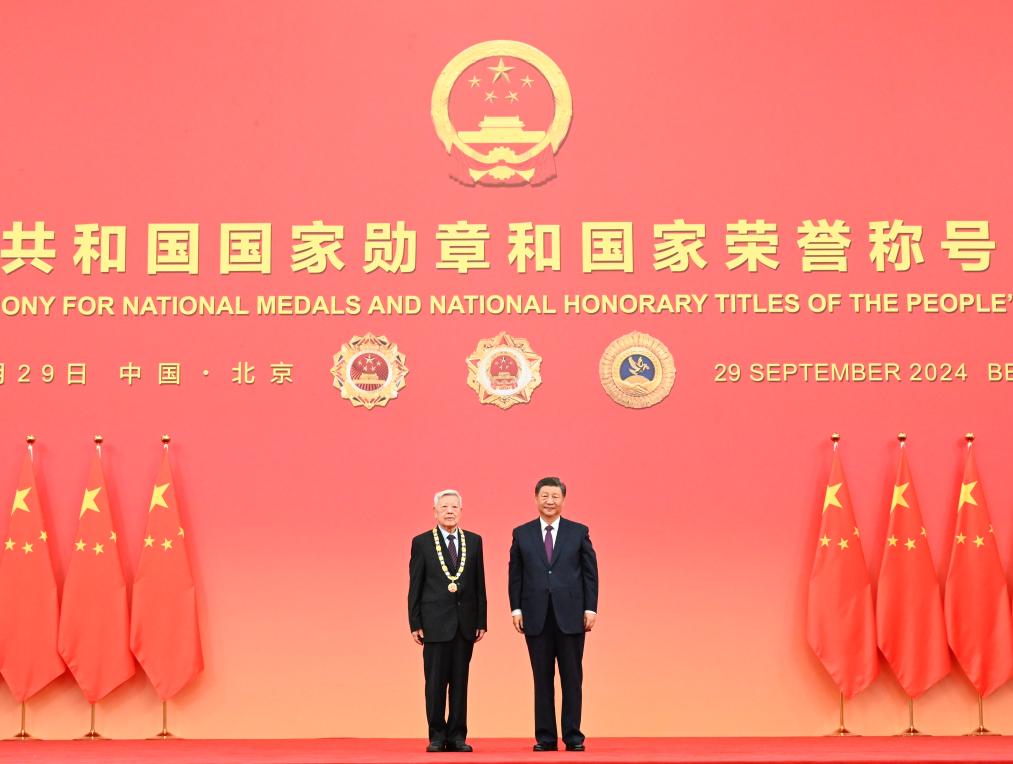 Chinese President Xi Jinping, also general secretary of the Communist Party of China (CPC) Central Committee and chairman of the Central Military Commission, presents the medal for the title of People's Scientist to Zhao Zhongxian in Beijing, capital of China, Sept. 29, 2024. A presentation ceremony for national medals and national honorary titles of the People's Republic of China was held at the Great Hall of the People in Beijing on Sunday. (Xinhua/Xie Huanchi)
