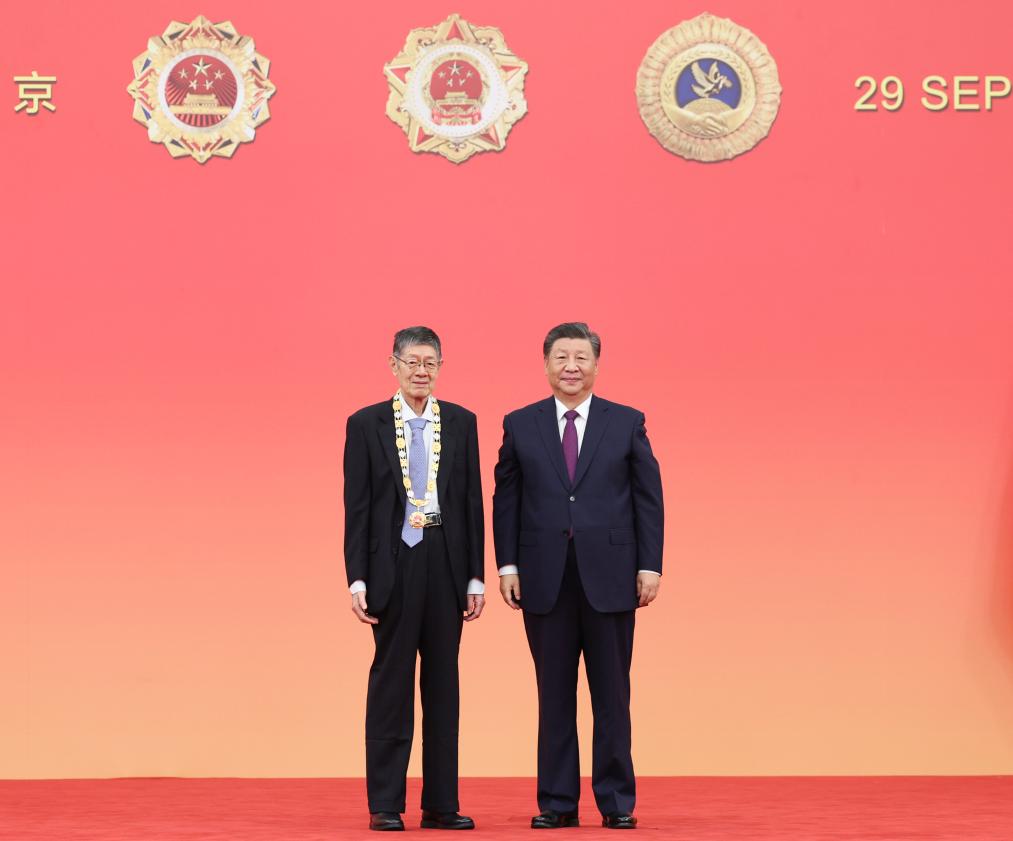Chinese President Xi Jinping, also general secretary of the Communist Party of China (CPC) Central Committee and chairman of the Central Military Commission, presents the medal for the title of People's Scientist to Zhao Zhongxian in Beijing, capital of China, Sept. 29, 2024. A presentation ceremony for national medals and national honorary titles of the People's Republic of China was held at the Great Hall of the People in Beijing on Sunday. (Xinhua/Ju Peng)