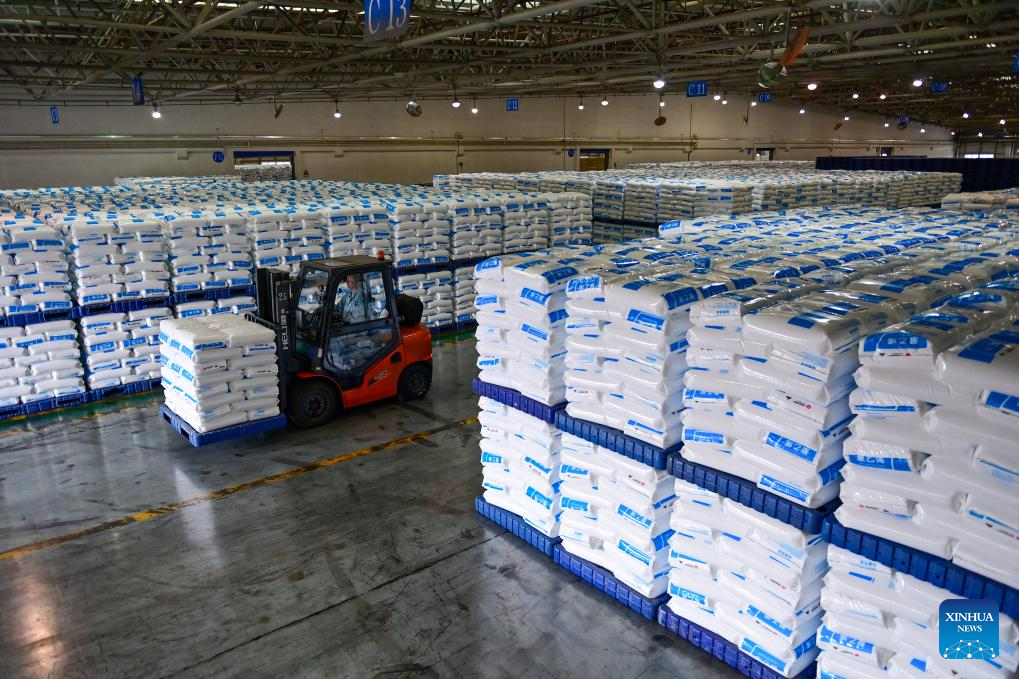A worker transports bagged polyethylene products at Xinjiang Chemical Co., Ltd., of China Energy Group in northwest China's Xinjiang Uygur Autonomous Region, Sept. 26, 2024. (Xinhua/Ding Lei)