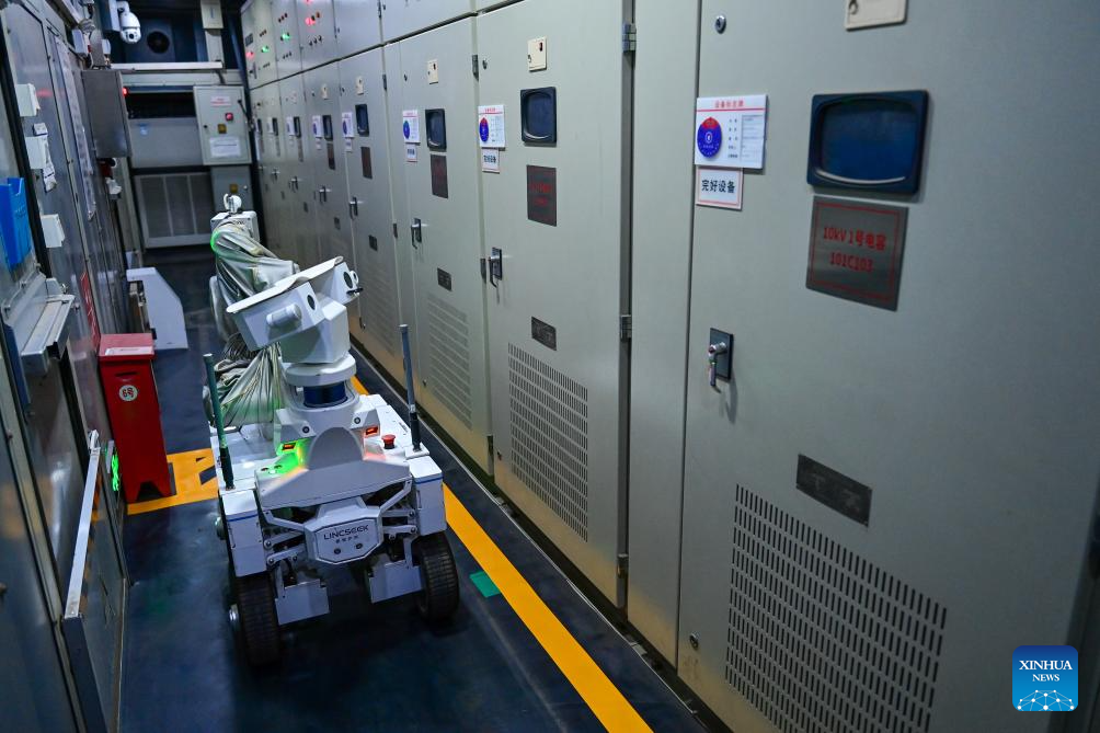 A robot inspects a power distribution room at a 110-kilovolt (kv) substation of Xinjiang Hongshaquan Energy Co., Ltd of China Energy Group in northwest China's Xinjiang Uygur Autonomous Region, Sept. 28, 2024. (Xinhua/Ding Lei)