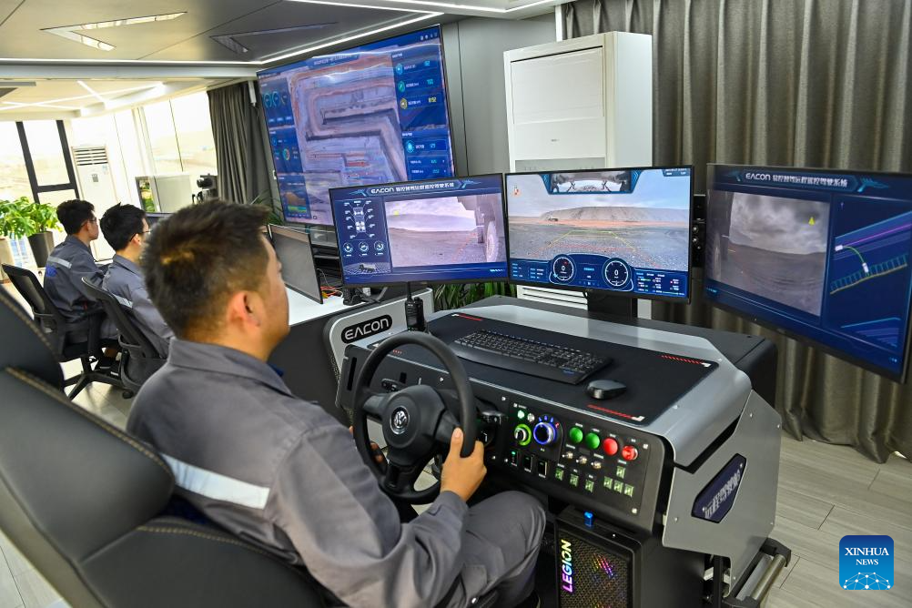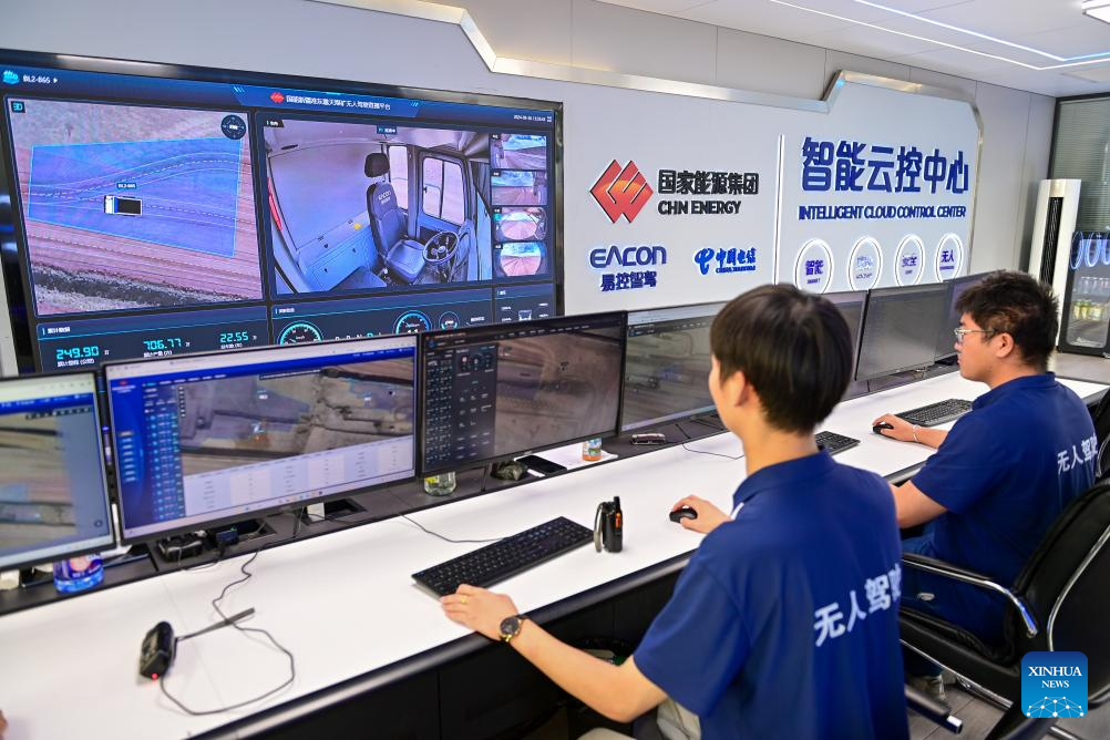 Staff members monitor unmanned vehicles at the No.1 open-pit coal mine of Xinjiang Hongshaquan Energy Co., Ltd of China Energy Group in northwest China's Xinjiang Uygur Autonomous Region, Sept. 27, 2024. (Xinhua/Ding Lei)